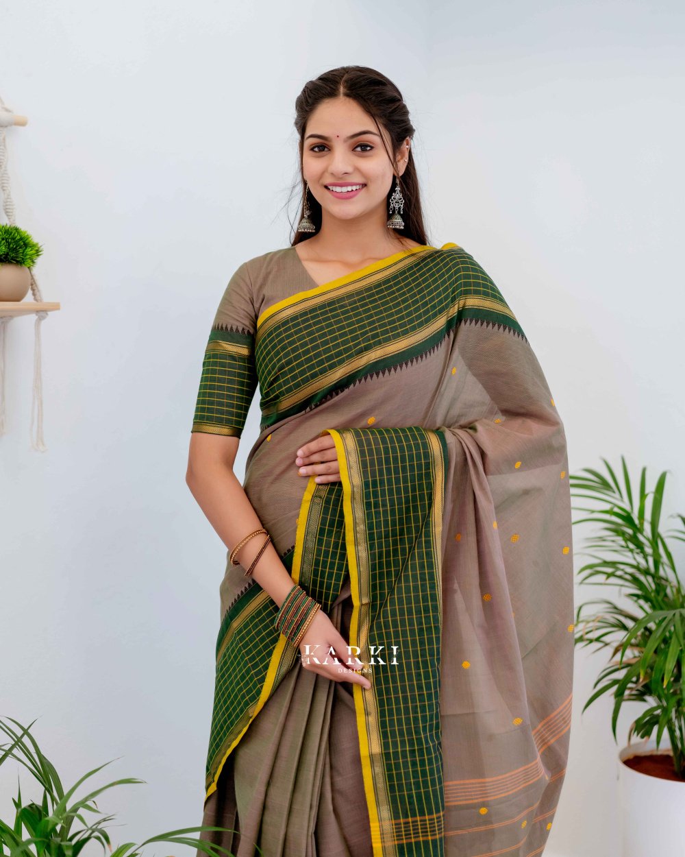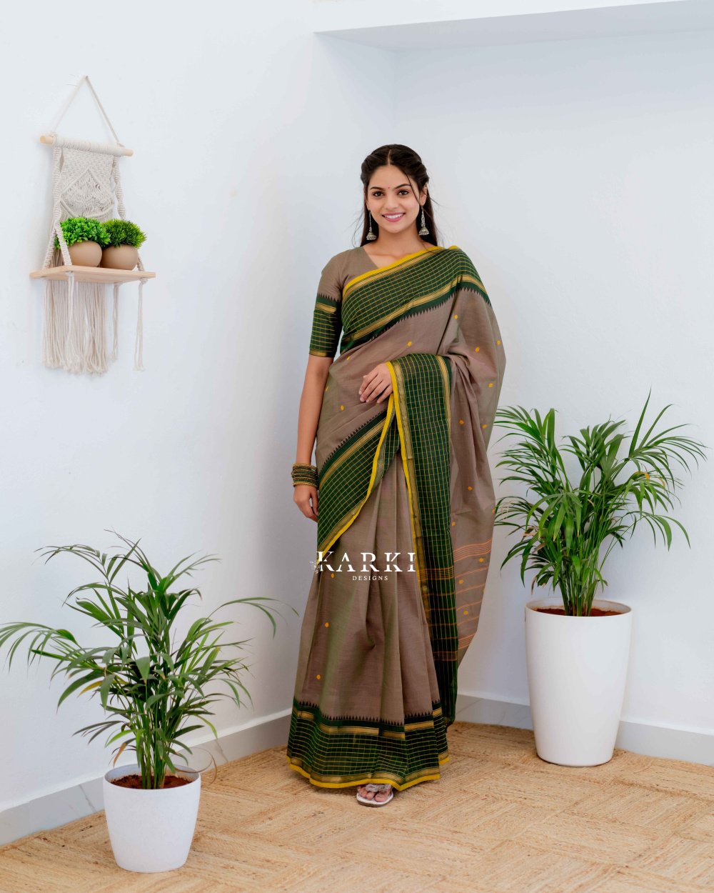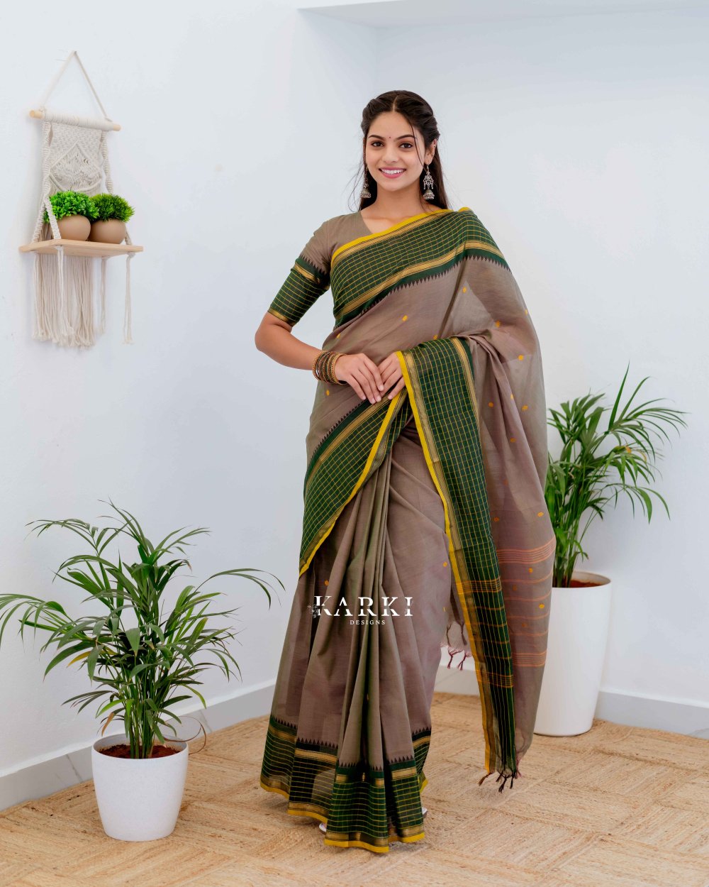 Gray & Green Checks Kanchi Cotton Saree - SKN -11