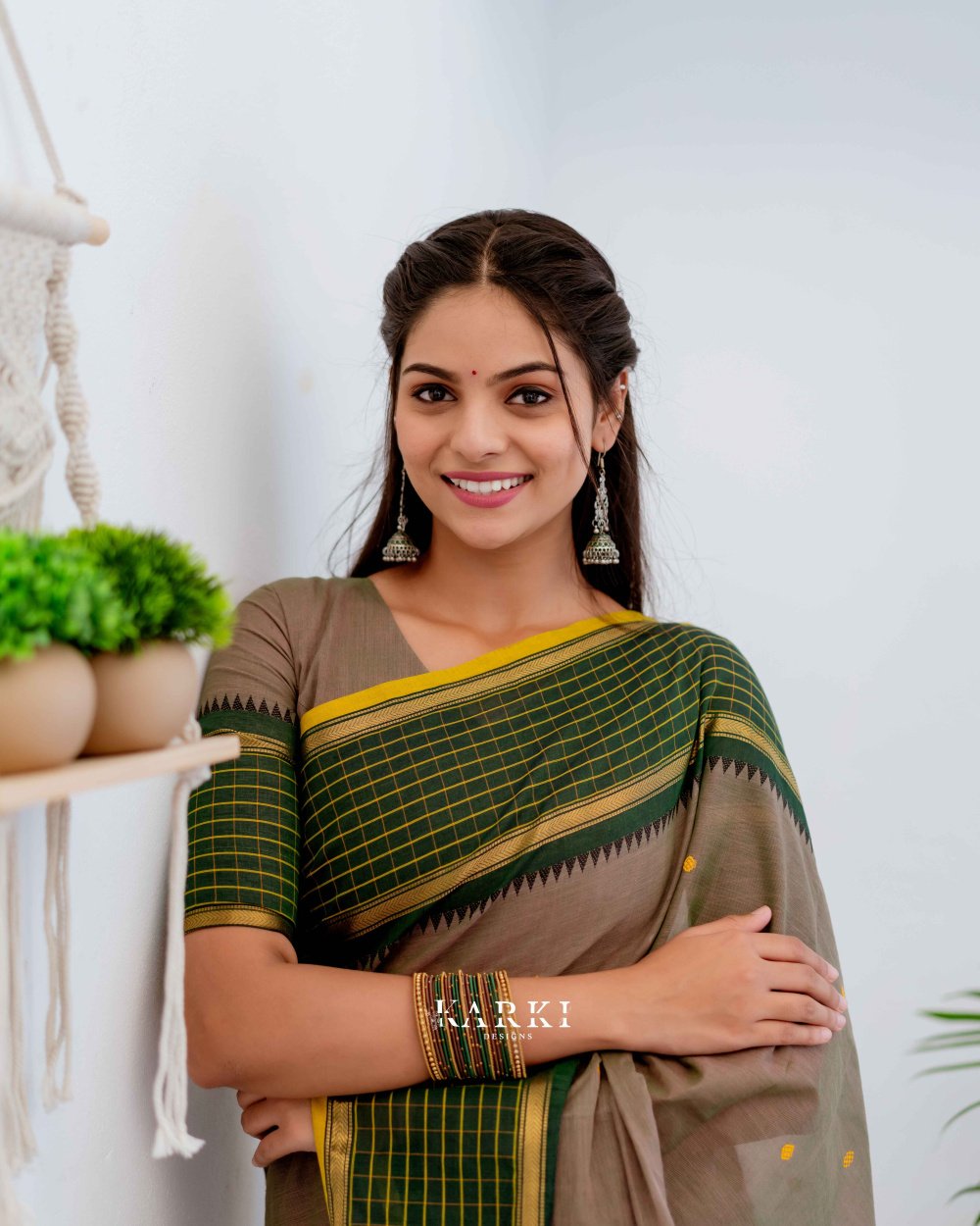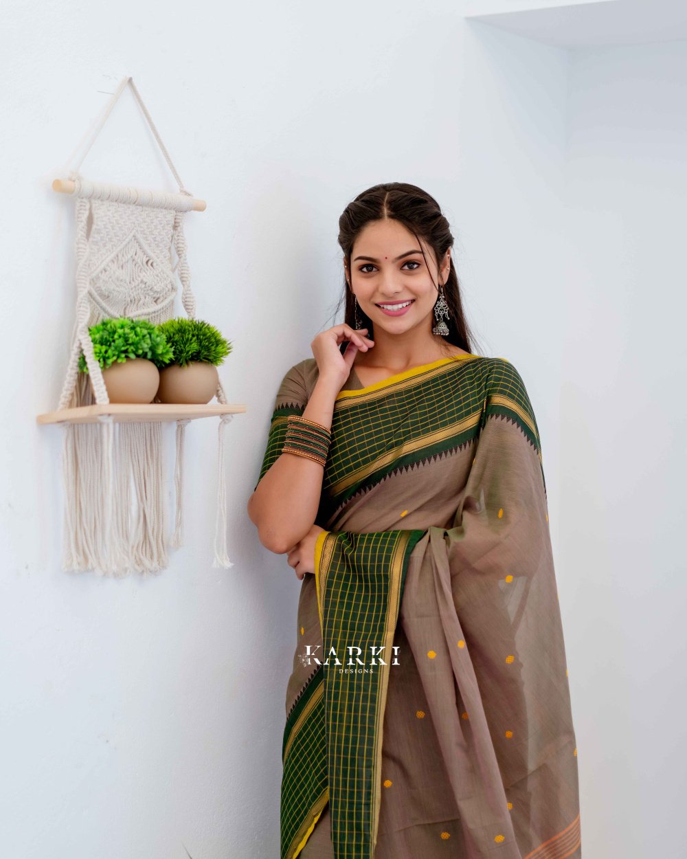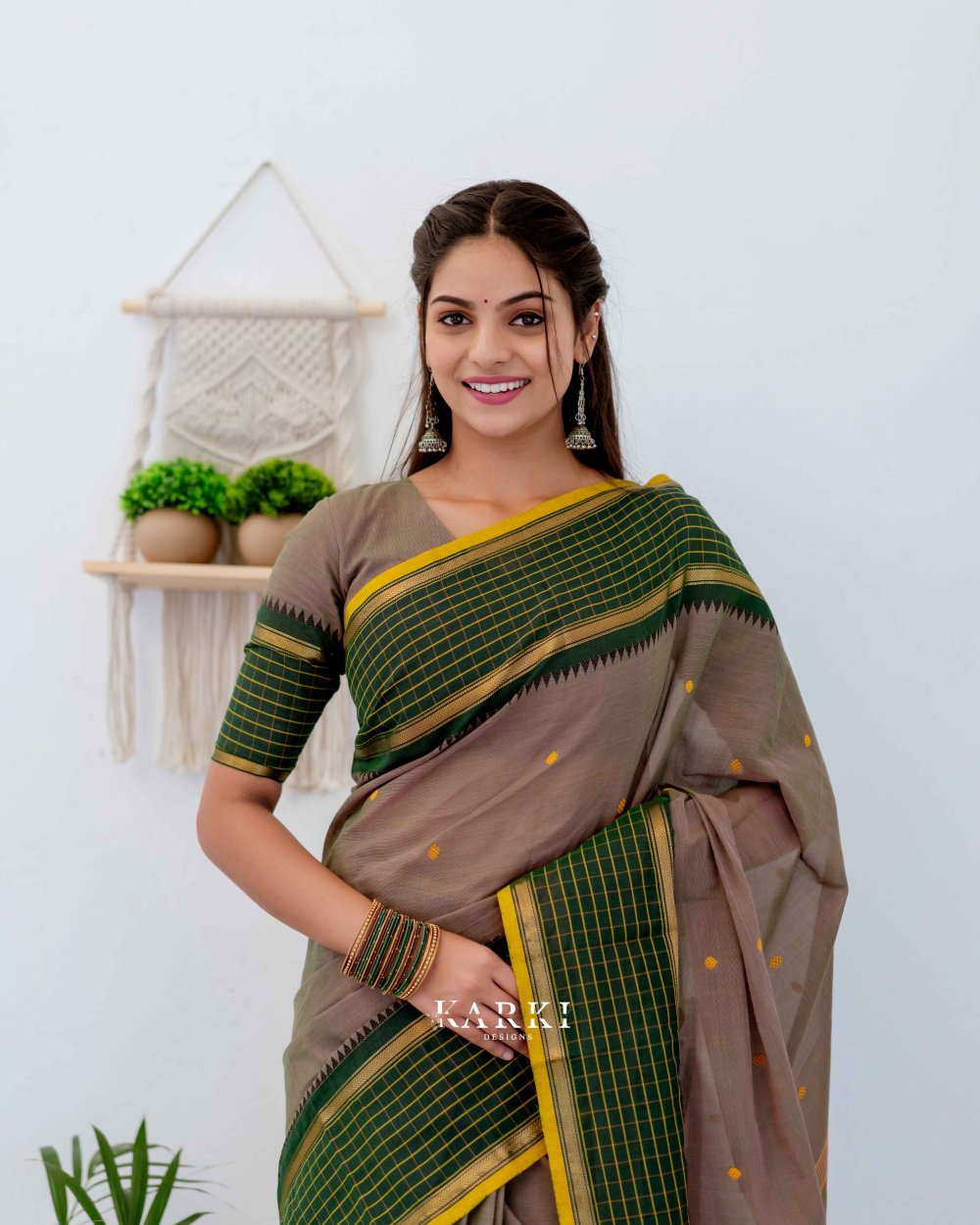 Gray & Green Checks Kanchi Cotton Saree - SKN -11
