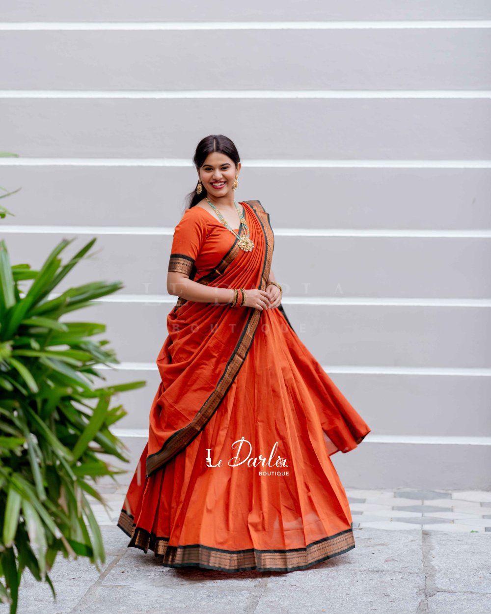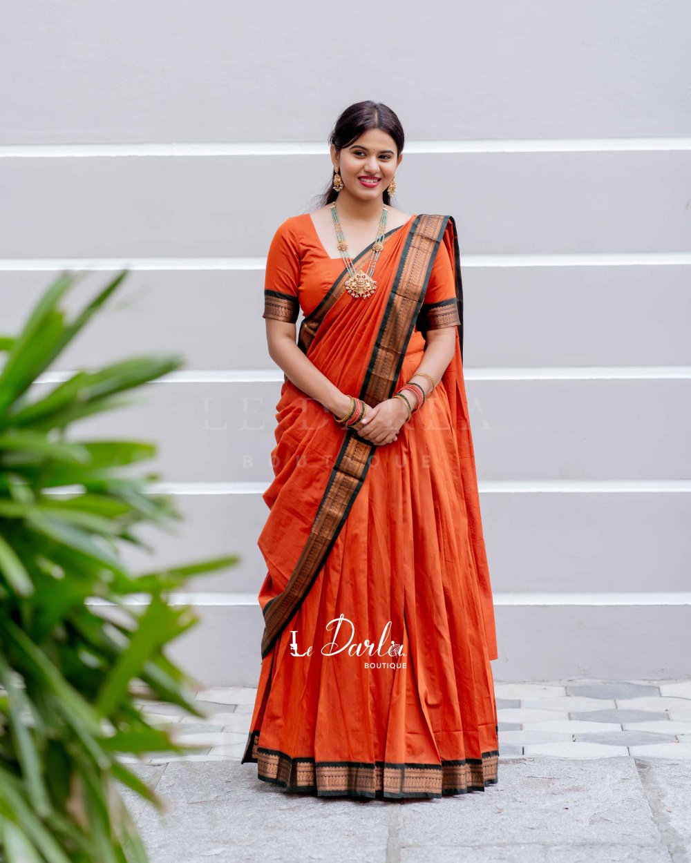 Kalyani cotton halfsaree - orange with green -HSKLM-11