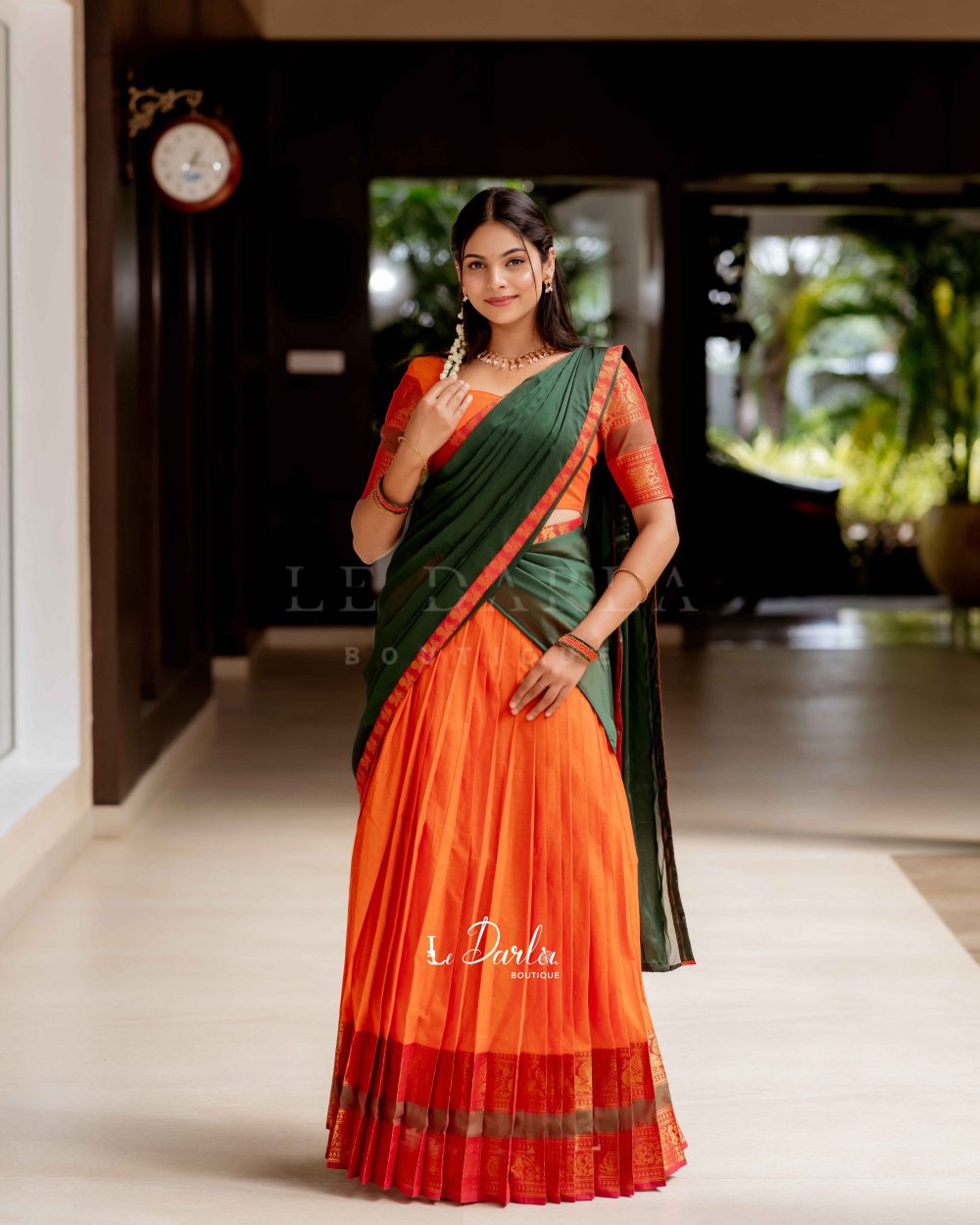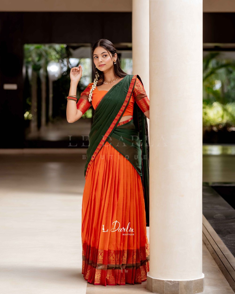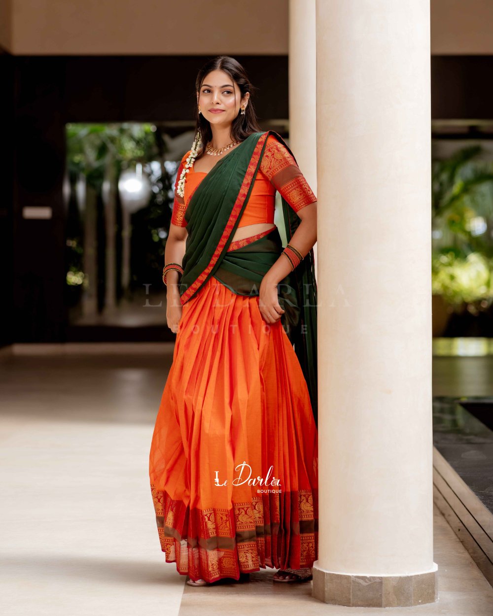 Kanchi cotton halfsaree - Orange with Green -HSKN -23