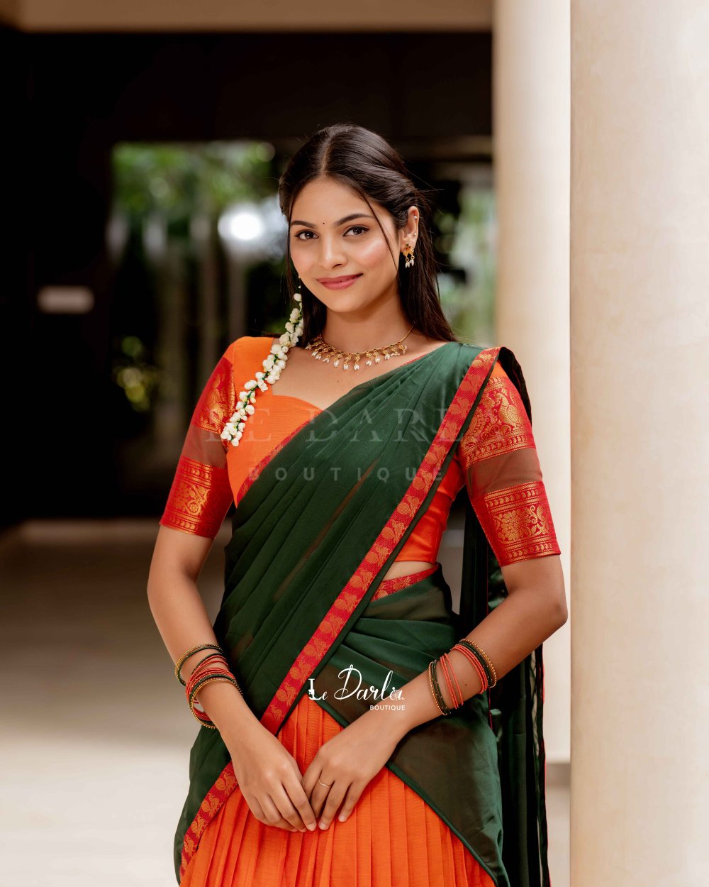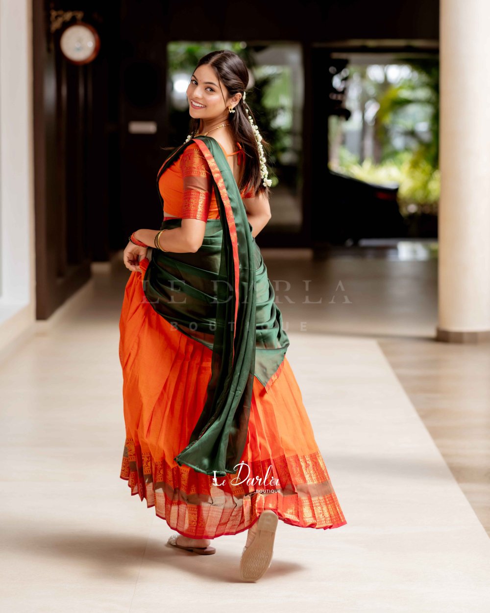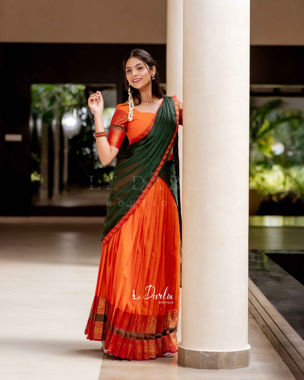 Kanchi cotton halfsaree - Orange with Green -HSKN -23
