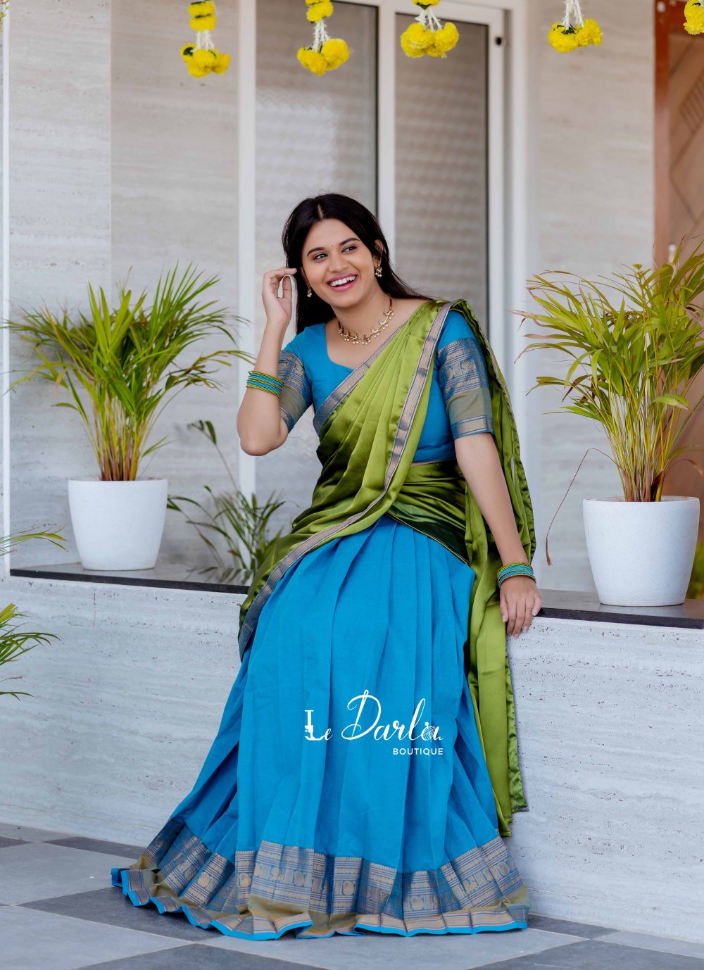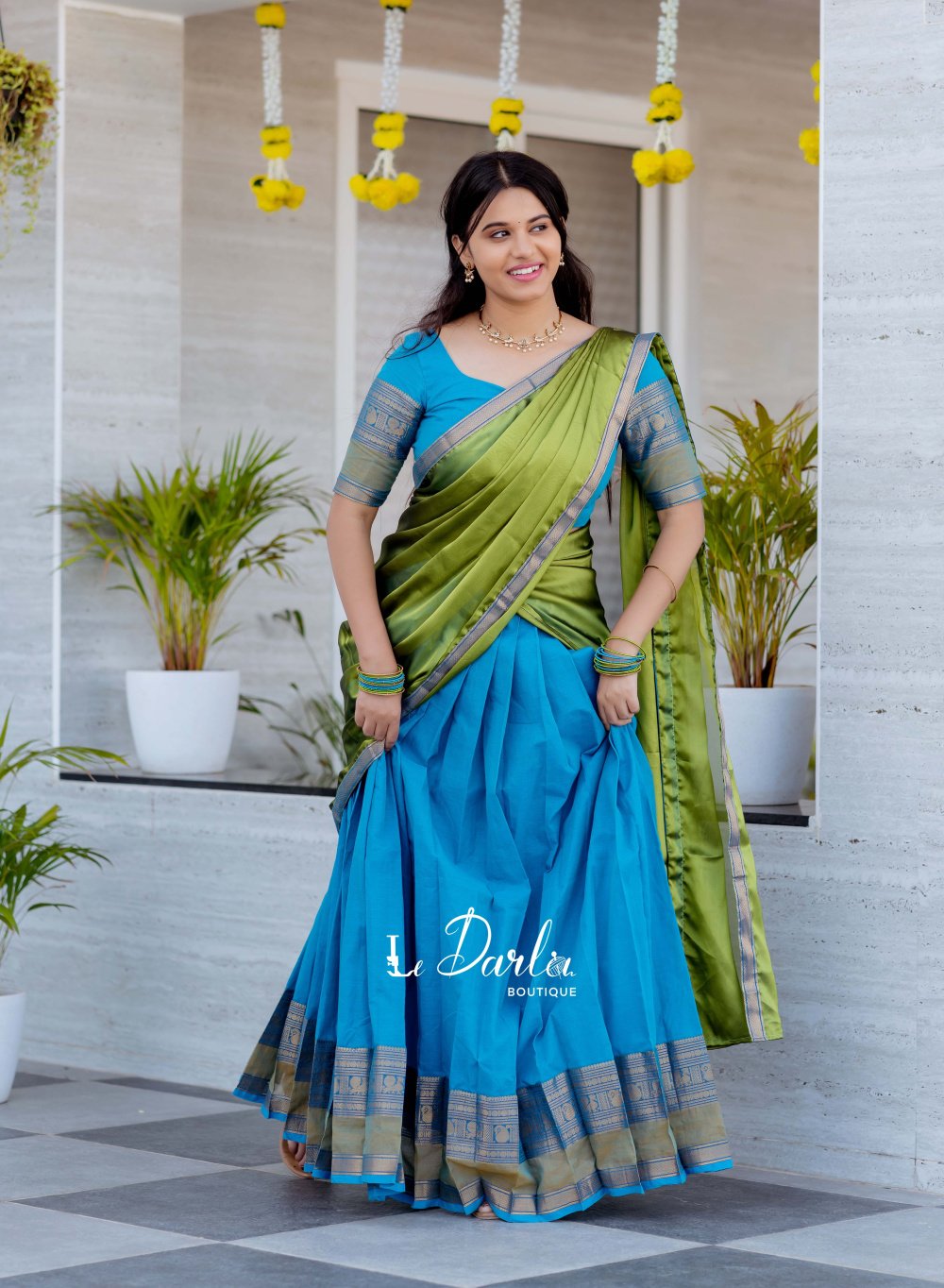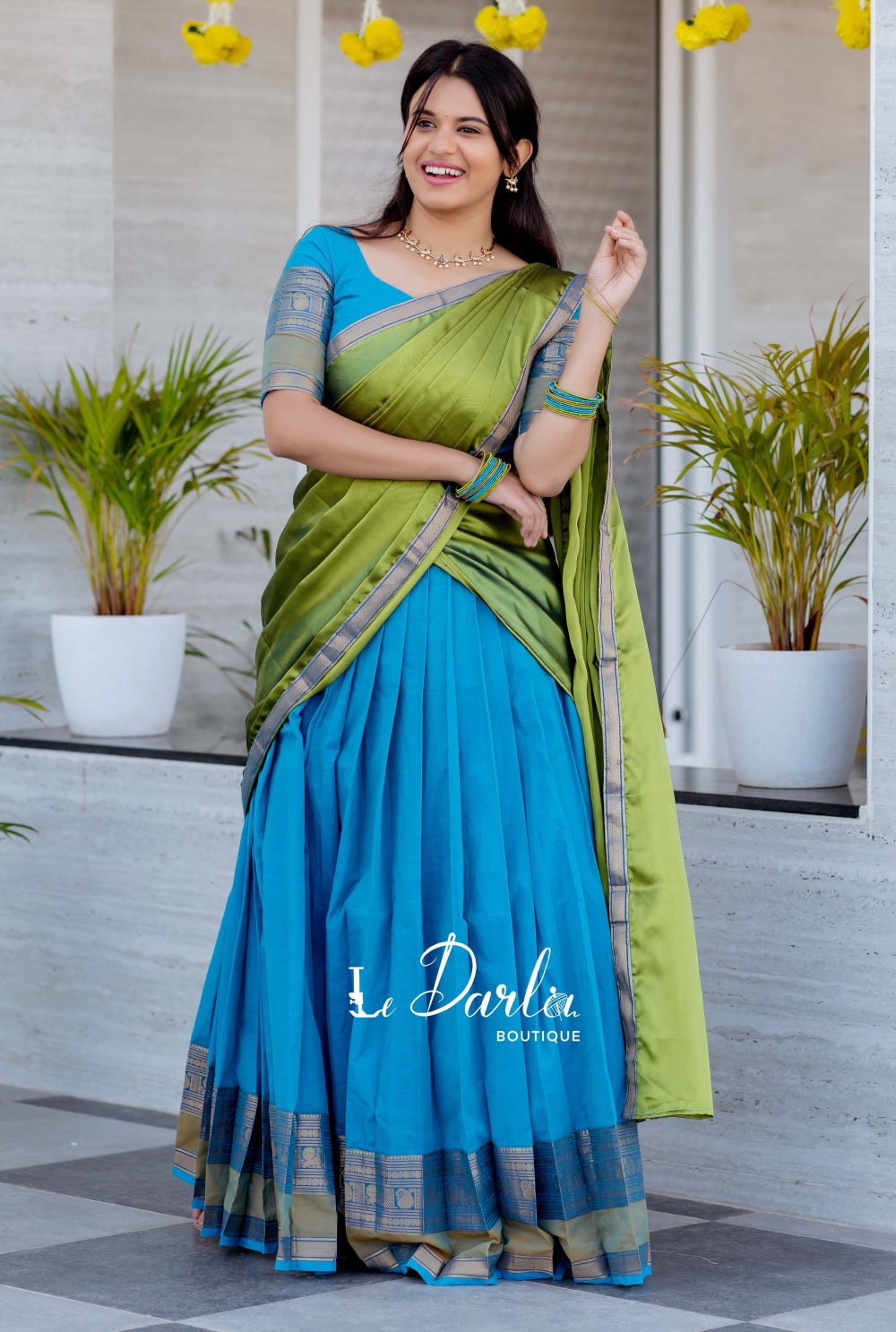 Kanchi Cotton Halfsaree - Skyblue & LIghtgreen - HSKN -30