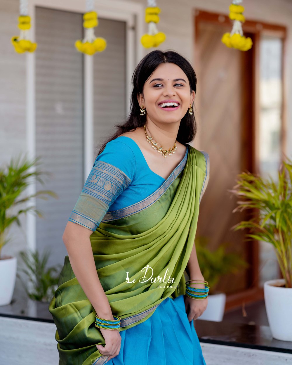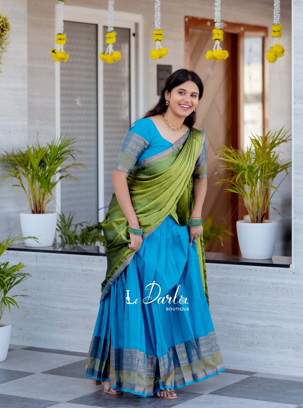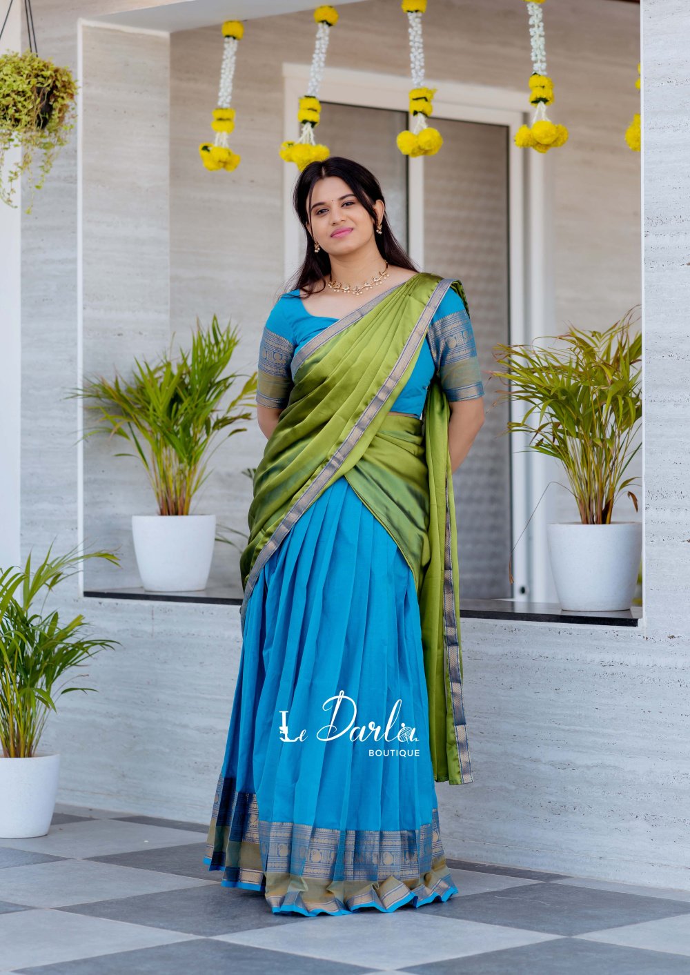 Kanchi Cotton Halfsaree - Skyblue & LIghtgreen - HSKN -30