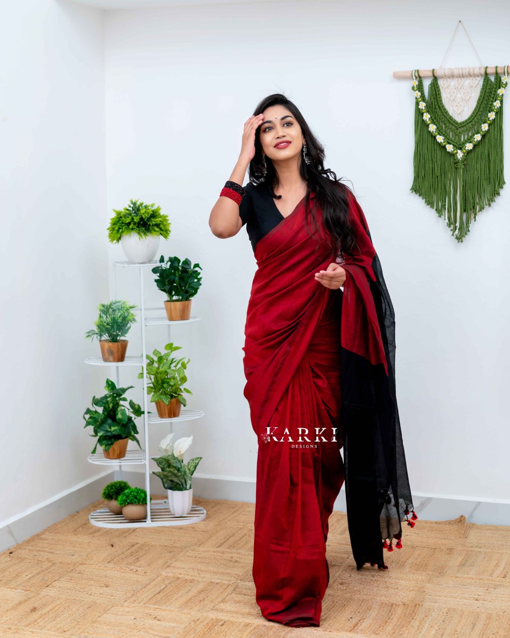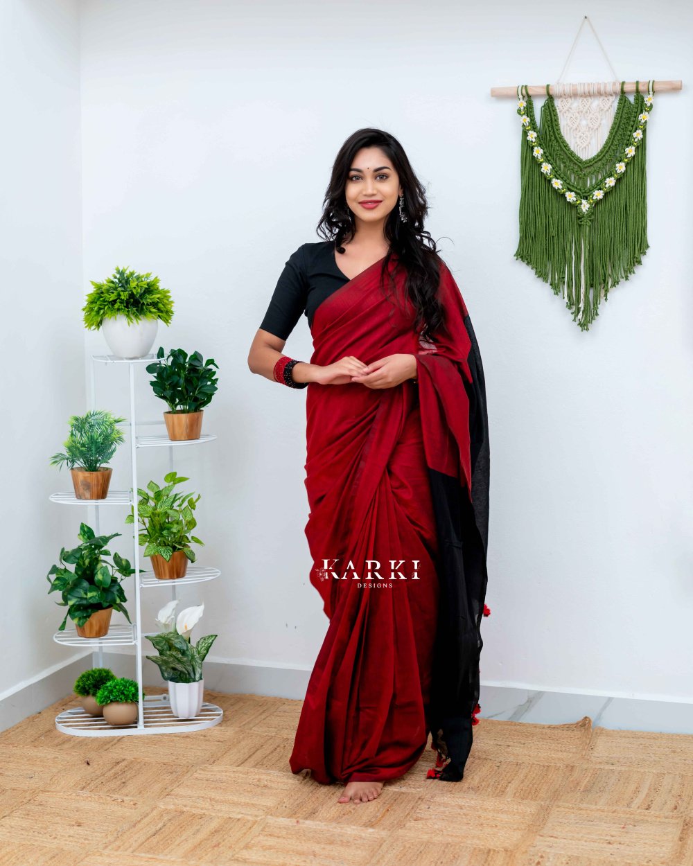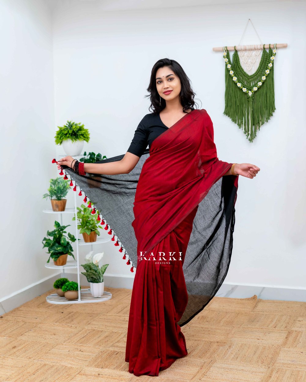 Maroon & Black Khadhi Cotton Saree - SKD -2