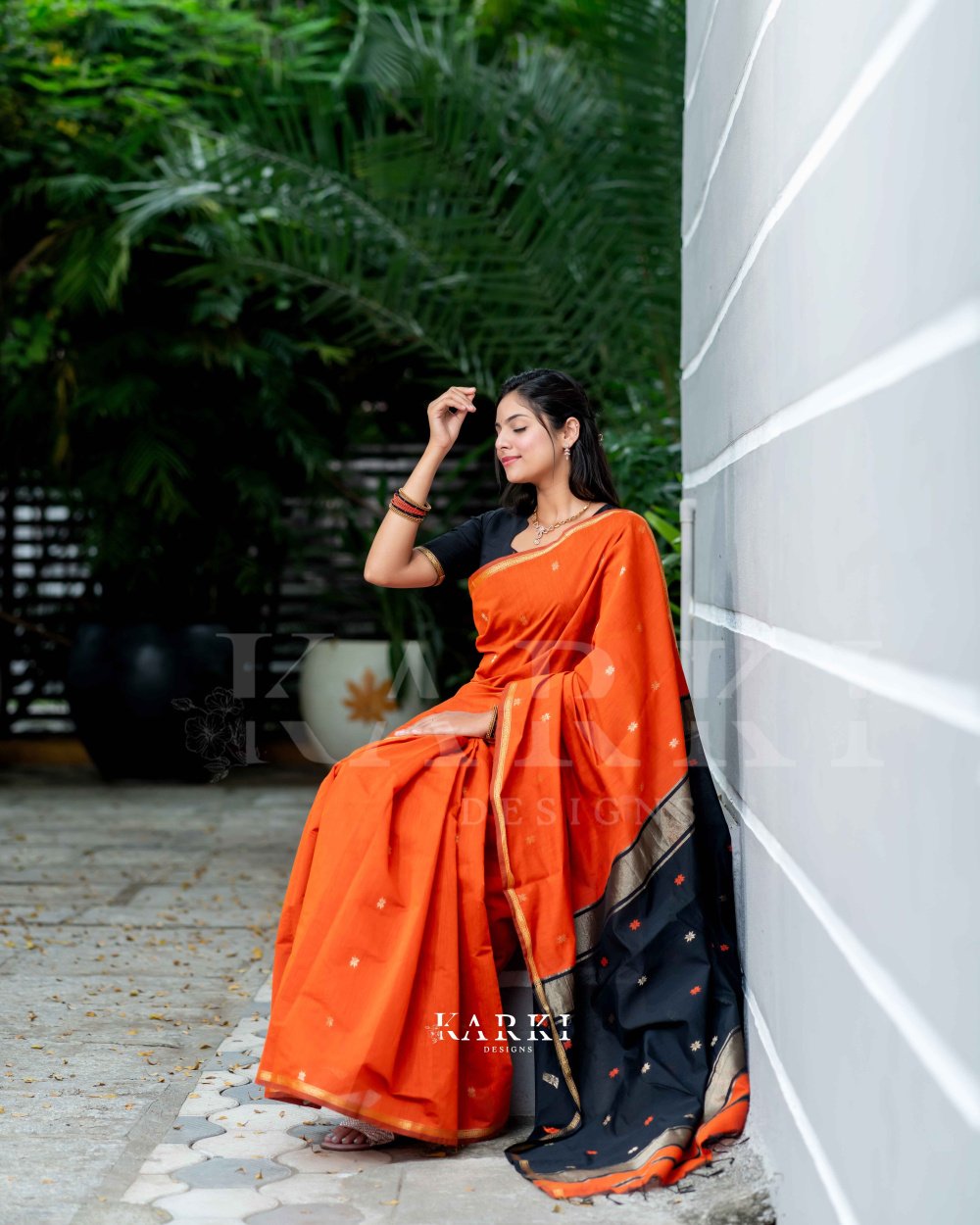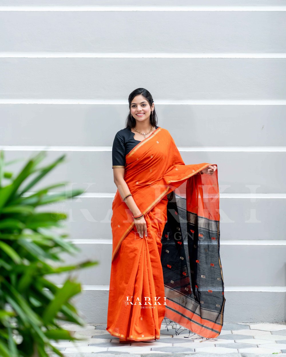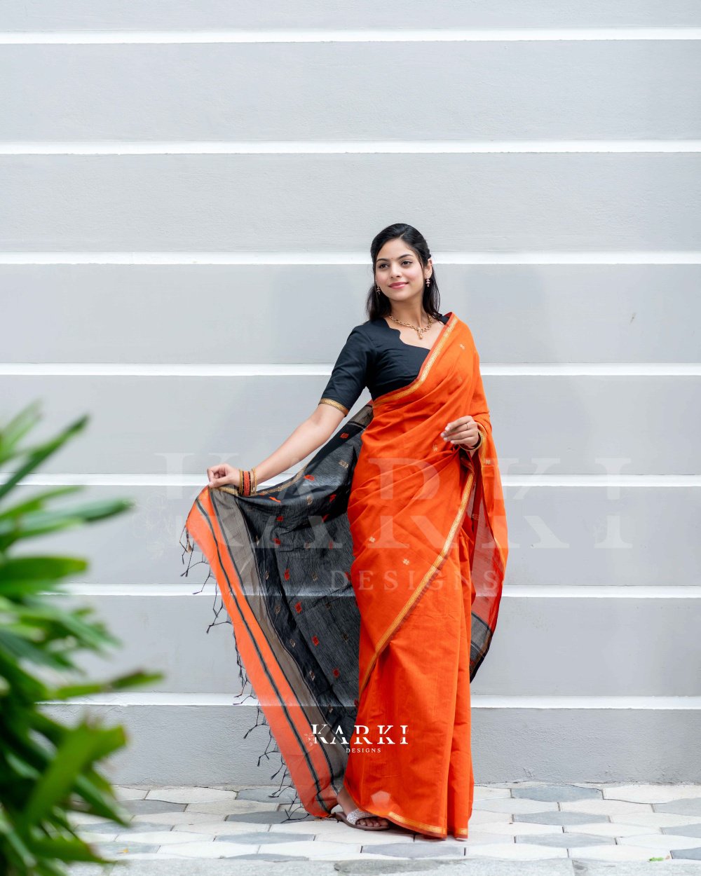 Orange & Black Maheswari Cotton Saree -SMK-2