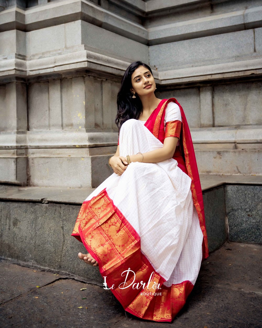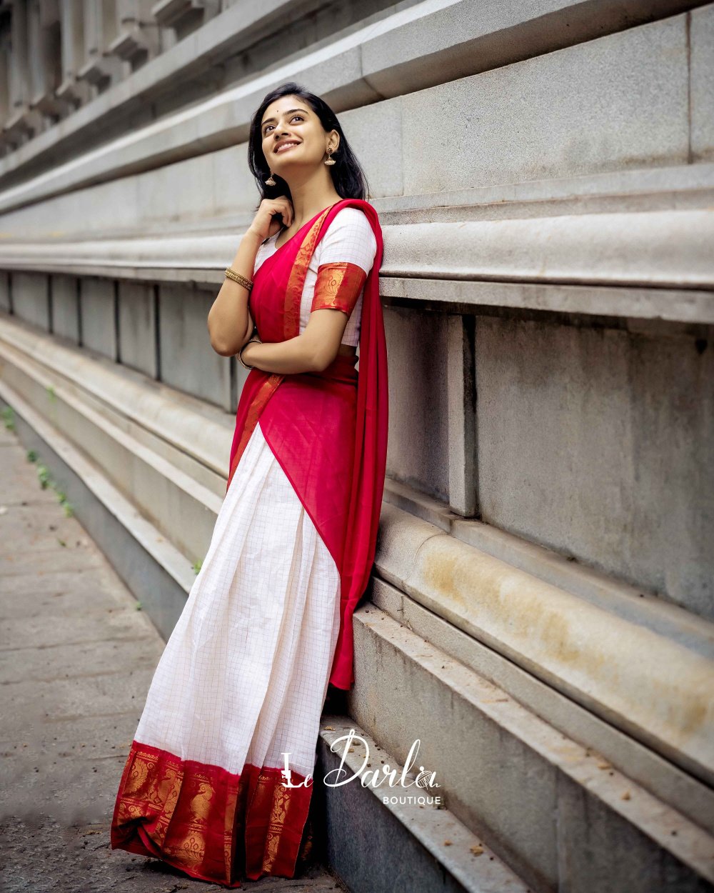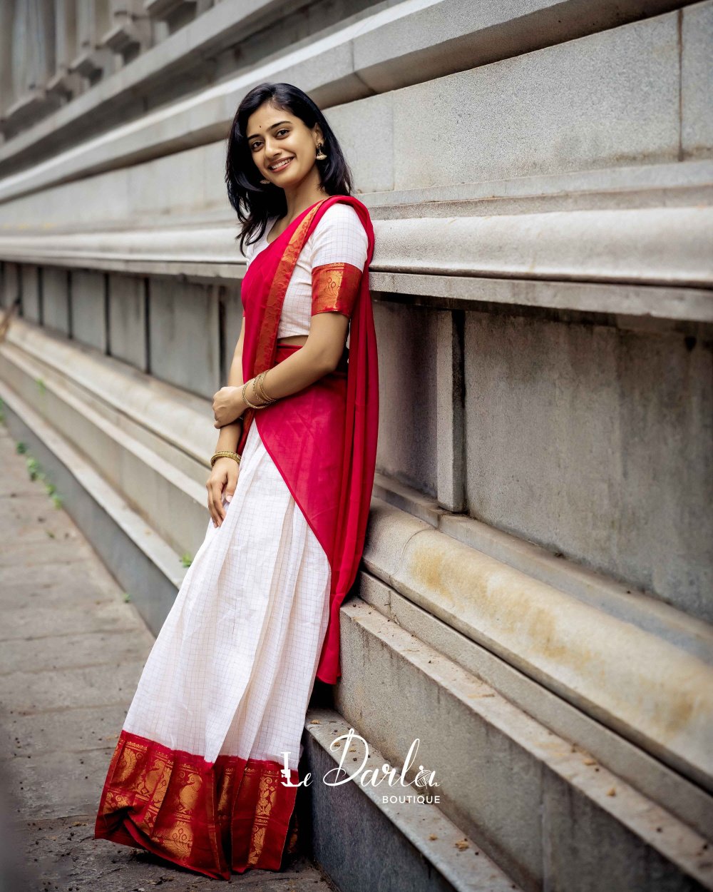 Sungudi Halfsaree - white with reddish pink -HSSU-9