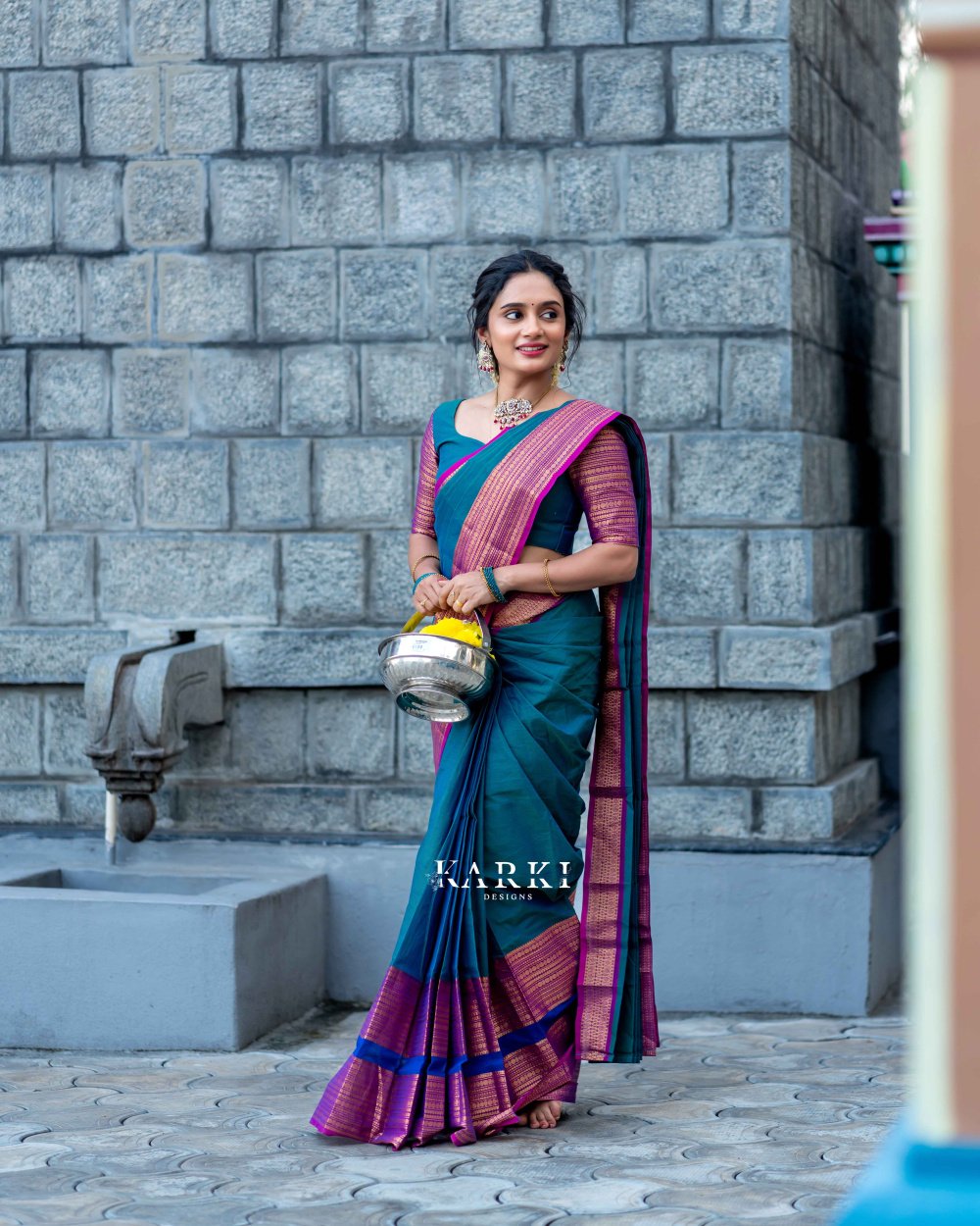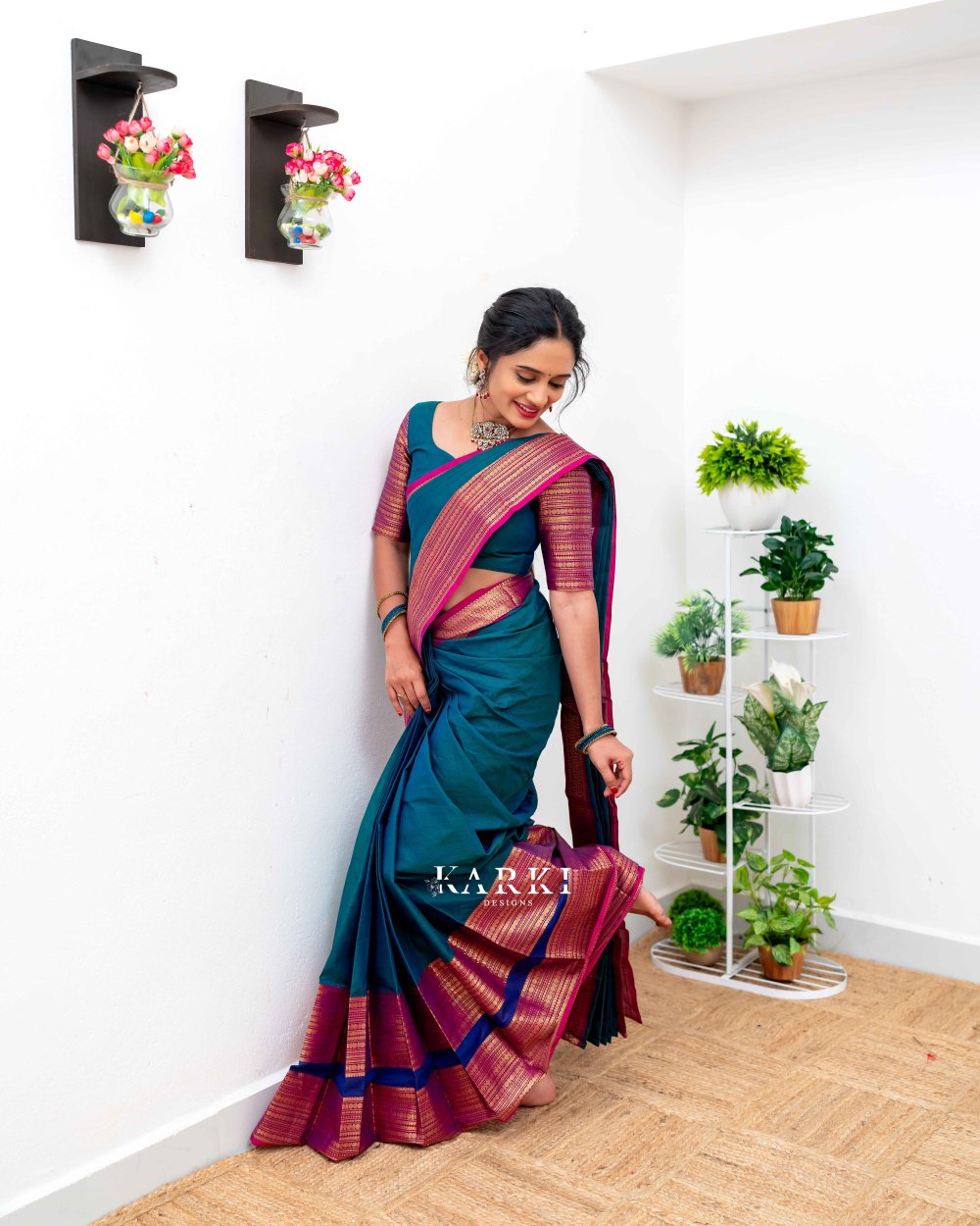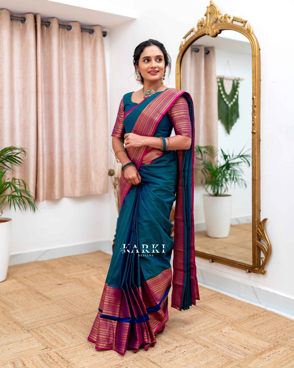 Turquoise & Dark Majenta Kanchi Cotton Saree - SKN -26